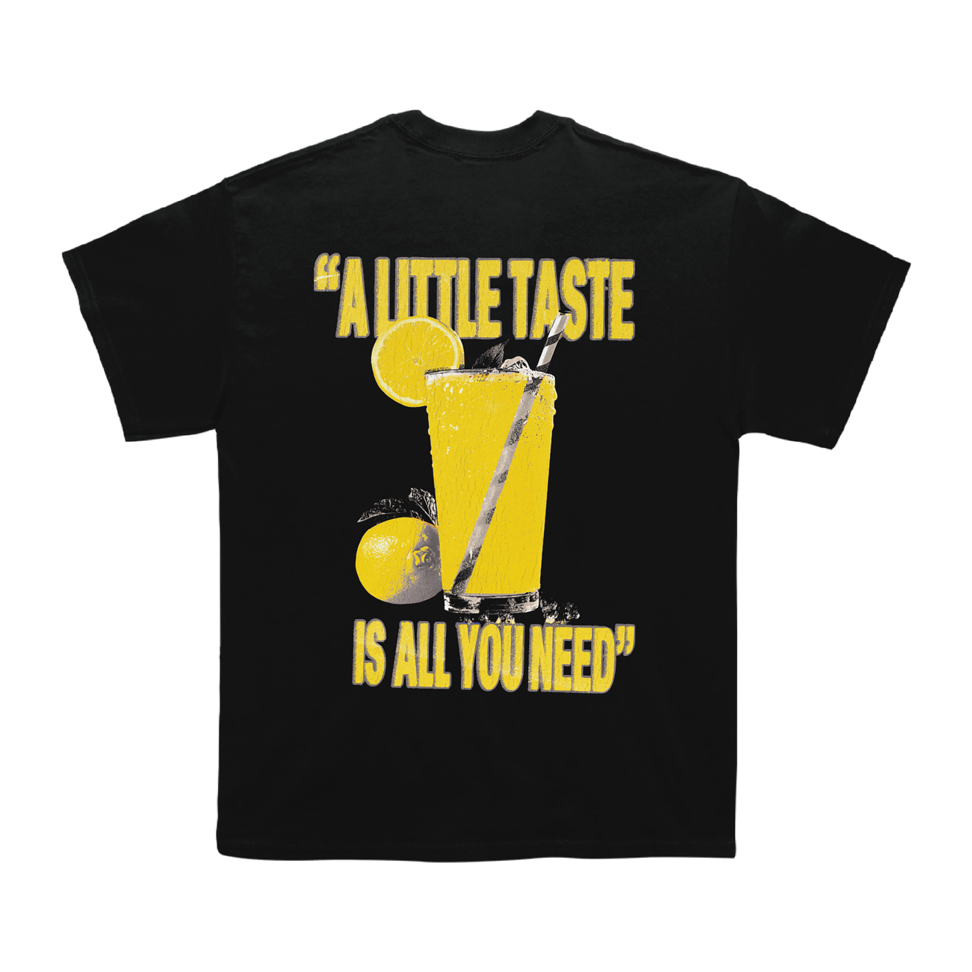 This classic black T-Shirt features a Louis' Lemonade front print and A Little Taste Is All You Need graphic back print in vibrant yellow. Crafted from 100% cotton, this heavy-weight 240gsm T-Shirt offers a premium feel with a relaxed, structured fit. Featuring dropped shoulders, wide neck ribbing, and double-needle hems.