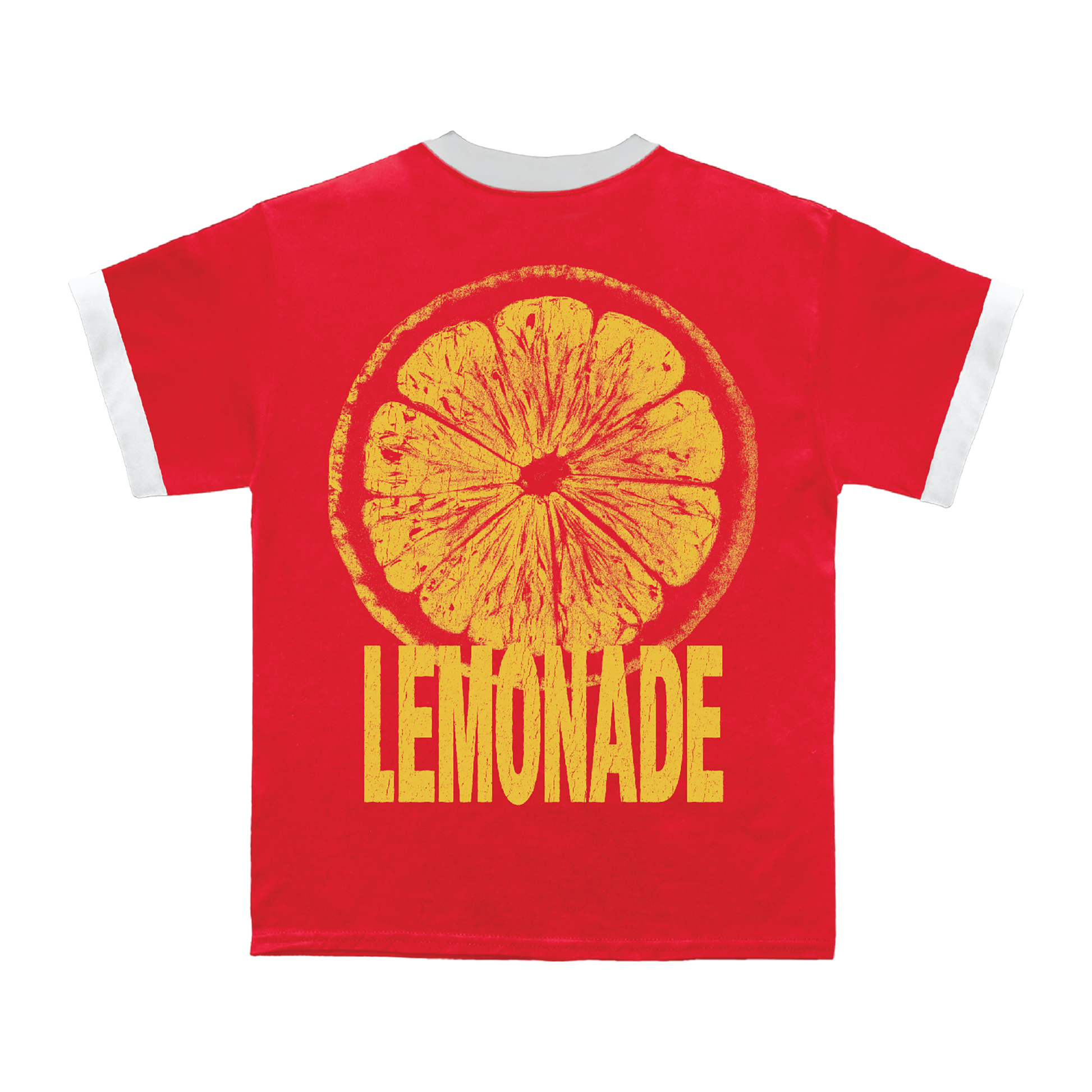 Inspired by the Lemonade single artwork, this classic red ringer T-Shirt features a white trim on the sleeve and neck. Finished with a vibrant yellow Lemonade print on the front and lemon graphic on the back. Made from 100% ringspun cotton for a soft-touch feel, we recommend ordering true to size.